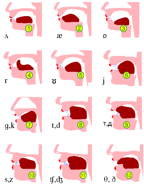 1. Кончик языка прижать к нижним зубам. 2. Кончик языка прижать к верхним зубам. 3. Кончик языка прижать к альвеолам (бугоркам над зубами). 4. Кончик языка поднять выше альвеол и слегка загнуть кверху. 5. Кончик языка поместить между зубами и быстро убрать, вернуть язык в нейтральное положение. 6. Кончик языка поместить между зубами и продуть воздух через щель.